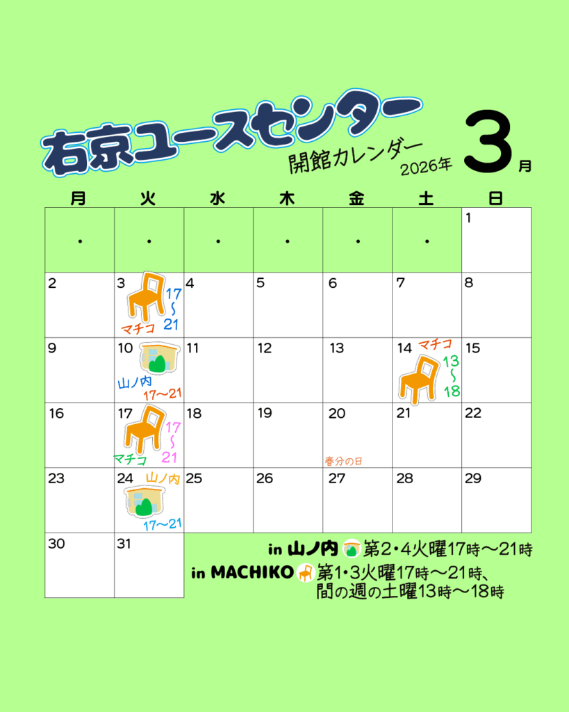 日時:第1、第3火曜日の17時から21時までと、その間の土曜日の13時から18時までオープン(2026年4月からは土曜日は第2土曜日に固定)
